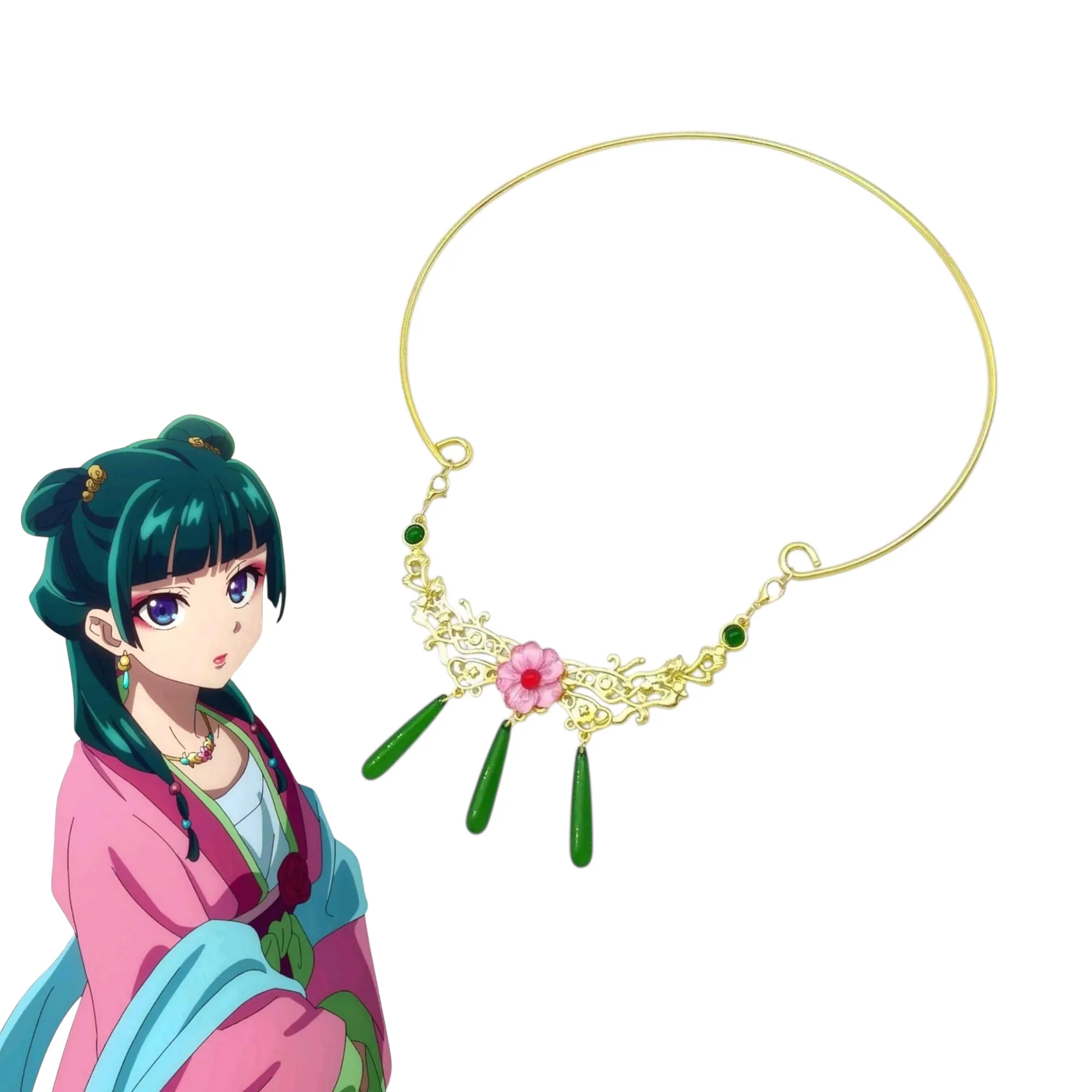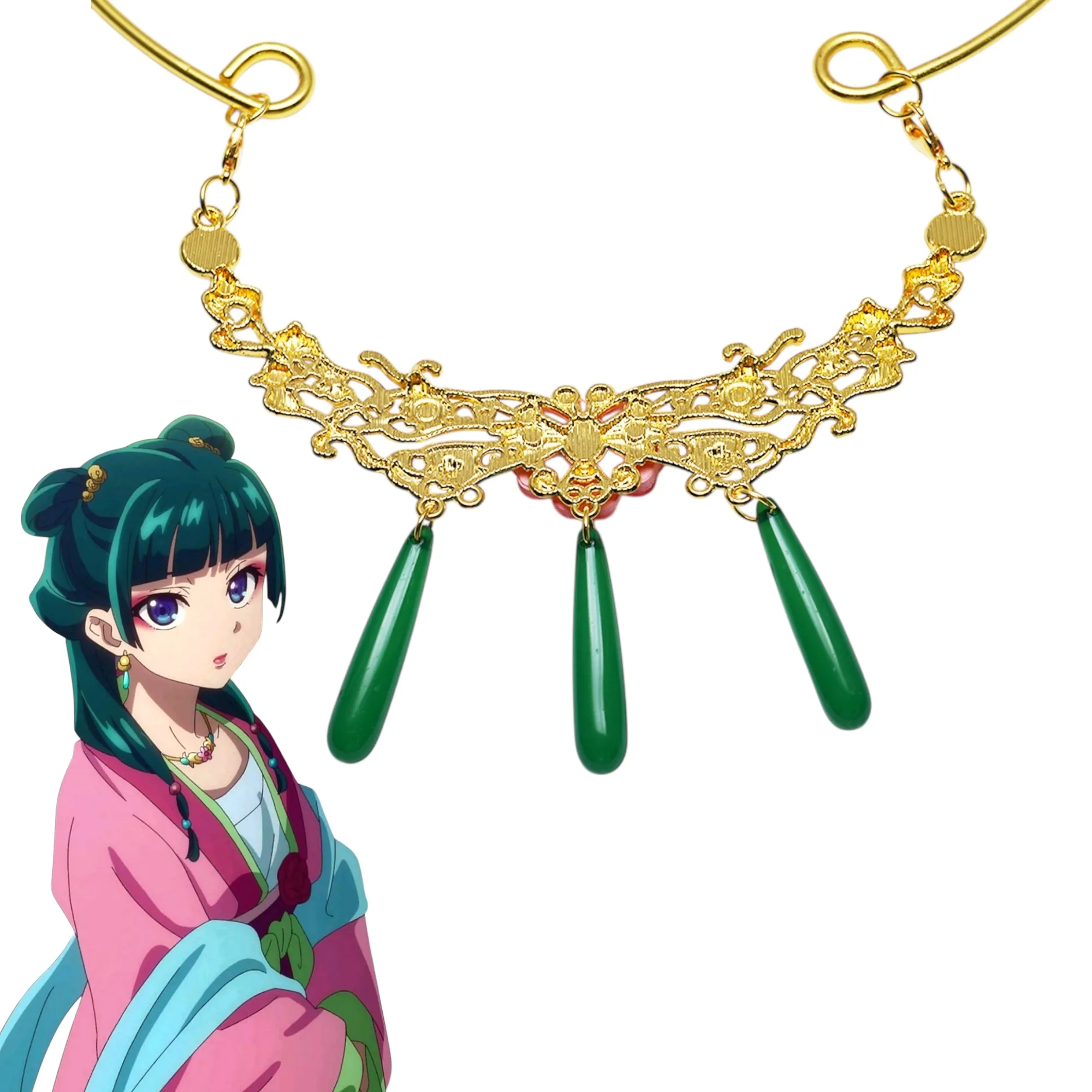 Ця прикраса натхненна витонченою атмосферою аніме The Apothecary Diaries, де східна естетика, палацові інтриги та увага до деталей відіграють ключову роль. Дизайн відсилає до прикрас, які носять персонажі імператорського двору: елегантна золота основа з ажурними візерунками поєднується з зеленими підвісками, що асоціюються з травами, ліками та знаннями — важливими елементами історії.