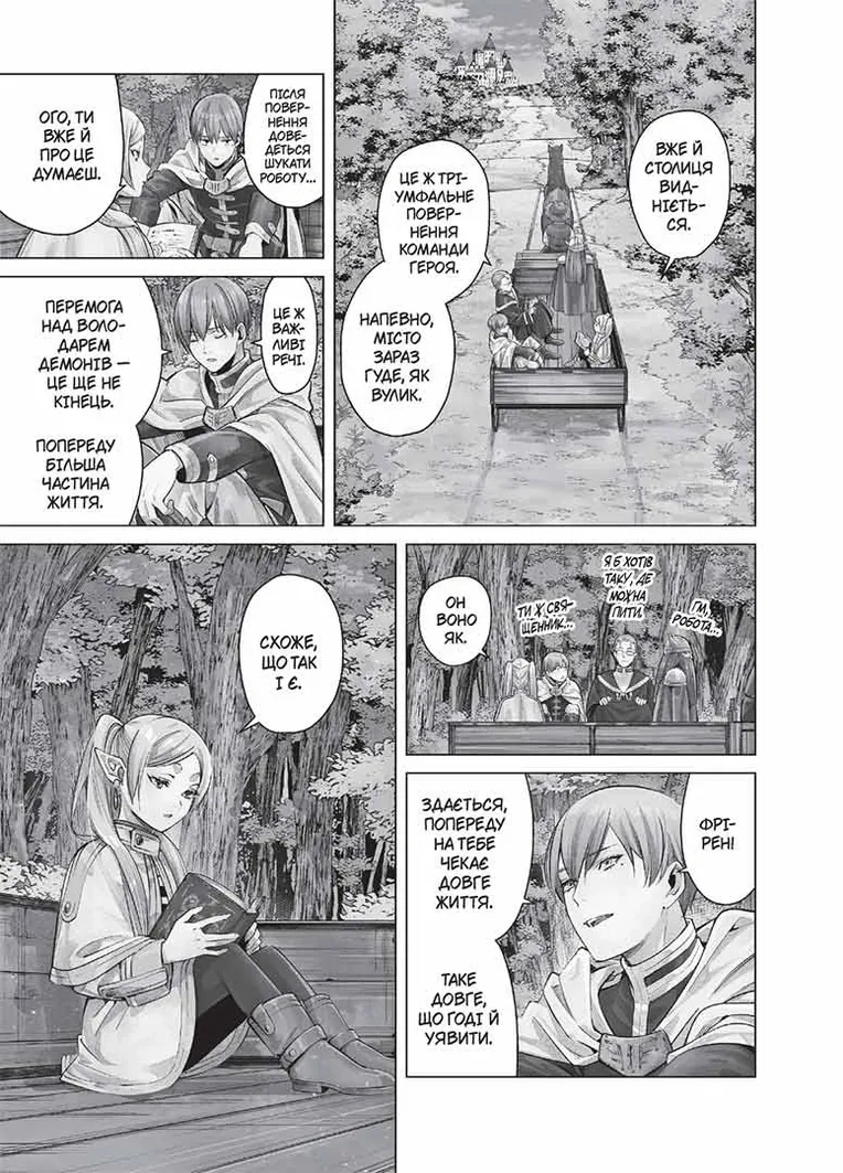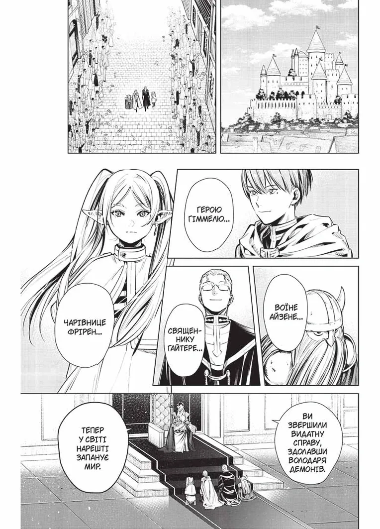 Ельфійка-чарівниця Фрірен та її відважні побратими повертаються додому після переможної пригоди. Вони подолали Володаря демонів і принесли на ці землі мир… Але ельфійське життя незрівнянно довге, й зовсім скоро від команди героя Гіммеля нікого, крім Фрірен, не залишиться… Та чи здатна ельфійка, яка не знає, що таке старість, осягнути скінченність людського життя?